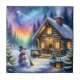 Une photo de style aquarelle capturant une nuit de Noël tranquille avec un cabine en rondins et un joyeux bonhomme de neige à l'extérieur.