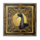 Une image saisissante avec une autruche noire contre un cadre ornemental doré et noir, évoquant un sentiment d'opulence et d'exotisme. Le contraste entre les plumes noires et épurées de l'autruche et les détails complexes et élégants du cadre crée une composition visuellement captivante.