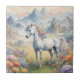 Un carreau en céramique montrant une image rêveuse d'une licorne blanche avec une crinière arc-en-ciel debout dans un champ de fleurs. Dans l'arrière - plan se trouvent des montagnes majestueuses. Le cadeau parfait pour donner à ceux qui aiment les licornes magiques et mystiques. Contient du contenu génératif.