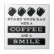Ce carrelage en céramique moderne est parfait pour les amateurs de café. Il comprend quatre tasses à café suspendues avec des mots en dessous qui se lisent "Commencez votre journée avec un café et un sourire". Ce design est idéal pour une cuisine, un bureau ou juste pour décorer n'importe quelle pièce.