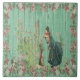Carrelage en céramique à l'ancienne avec enfant, lapin et roses ludiques, le tout dressé contre un arrière - plan en bois. Cette tuile personnalisée fait le cadeau parfait pour les personnes qui aiment les articles vintages.