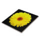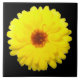 Cette tuile impressionnante présente une photo d'une jolie fleur de marigold jaune fluorescent sur un arrière - plan noir.