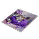 A tile with a sweet kitty cat sitting on a ball of purple yarn and next to a purple vase of flowers.
