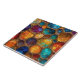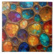 Une oeuvre abstraite et captivante qui ressemble à des cellules interconnectées colorées ou à des vitraux aux bordures dorées et texturées.