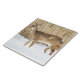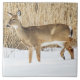 Un cerf à queue blanche se dresse dans un champ enneigé avec de hautes roseaux dans l'arrière - plan.