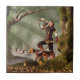 Les brumes se dégagent sur une scène dans une forêt dense. Le long des banques rocheuses d'un courant d'enroulement, les chênes couverts par mousse se développent tordus et profondément. Une femme utilisant un équipement noir avec l'équilibre blanc de fourrure porte une lance et est accompagne d'une paire de chiens de chasse. Apercevant sa carrière, la chasseuse retentit un recheat sur son klaxon pour lui envoyer des chiens dans l'action.