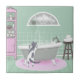 Un chaton gris et blanc chéri regarde les bulles monter d'un bain qui coule. Les roses et les verts sauge dominent cette scène cosy. Ma vie d'artiste a été de créer des récits sur les chats et la vie de chat pendant de nombreuses années. Dans cette série de carreaux d'art, je retourne à mes carreaux terry johnson.