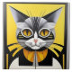 Représentation artistique stylisée de la tête d'un chat créée avec des formes géométriques audacieuses et des couleurs vives, véhiculant une atmosphère de design moderne et créatif.