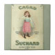 Antique Cacao Sucard — Chocolat Sucard de France Ils ont certainement aimé leur chocolat dans la France victorienne. Cacao Sucard signifie Chocolate Sugar. La petite fille antique vous lance un baiser, un baiser au chocolat. La petite fille vintage adore le chocolat. L'image à l'ancienne a été imprimée à l'origine sur une boîte de chocolat de 1900—publicité vintage pour le chocolat. L'arrière - plan est en vert antique et blanc antique, tandis que la petite fille est debout, envoyant un baiser à votre façon. L'image à l'ancienne est une petite fille brune aux cheveux portant sa boîte de chocolats. Elle porte une jolie petite robe bleue et rose. C'est l'art publicitaire vintage parfait pour les amateurs de chocolat.