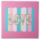 Joli design du mot Amour dans les couleurs pastel vives rose miel, jaune citron, bleu doux avec un arrière - plan rayé ajoute une touche douce à toute pièce. La dalle d'accenté peut être un joli ajout à n'importe quel mur carrelé.