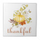 Ce joli carrelage en céramique saura vous plaire, vous et vos invités, ce jour de fête de Thanksgiving. Le design présente une jolie illustration citrouille d'aquarelle avec des feuilles d'automne et des couleurs d'automne d'or, de rouille, d'orange et de vert. Sous le citrouille se trouve le texte qui dit "reconnaissant".