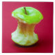 Photo d'une grande pomme verte contre un arrière - plan rouge. La pomme est mangée, seul le noyau est laissé.