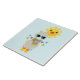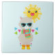Un carrelage en céramique avec un lama à l'allure cool portant des lunettes de soleil foncées. Habillé d'un foulard rayé coloré et de petites bottes amusantes. Un soleil jaune vif avec un joyeux visage kawaii dans l'arrière - plan. Des triangles pleins de couleurs géantes entourent ce lama amusant. Arrière - plan bleu.