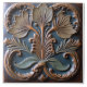 A square tile with a raised floral design, the tile has a dark blue-gray background, and the raised design is in shades of bronze and green, the design features three large leaves at the top, with smaller leaves and swirls around them, the leaves have a ribbed texture, and the swirls have a smooth, flowing appearance.