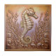 A charming addition to your decor, this tile features a majestic seahorse gracefully posed amidst detailed sea kelp and stylized waves. The faux bas-relief texture emphasizes the seahorse's ribbed body and coiled tail, while the rich, warm copper finish provides a sophisticated, metallic depth. This tile is perfect for adding a touch of high-end, artistic texture to industrial, rustic, or refined nautical spaces, serving as an exceptional feature piece. Search ID1223 to see other marine elements in this dramatic metallic series. Note: design may contain generative content.