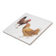 Cette tuile colorée a ma conception d'un jeune coq courant vers une poule de pavanement brune, avec un arrière - plan blanc simple.