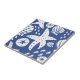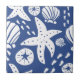 Ce carrelage bleu foncé et blanc a pour thème la plage côtière avec étoiles de mer, coquillages, oursins et pieds nus.