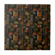 Sophisticated mid-century geometric pattern ceramic tile featuring layered circles, arches, triangles, and rectangles in forest green, burnt orange, ochre, and cream on a black background. Rich textures and retro-modern shapes create a bold design ideal for Bauhaus lovers, vintage décor fans, and anyone drawn to moody modern style.