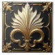 Une sculpture en relief carré sur un arrière - plan noir, avec une fleur de lis Art Déco centrale et élégante en ivoire et en or, entourée de motifs dorés et d'un cadre doré. La fleur de lis est stylisée avec des pétales longs et incurvés, et les accents dorés mettent en valeur les bords et les détails du design. Les motifs de cadre et de feuilles sont minutieusement détaillés, ajoutant à l'ensemble l'esthétique luxueuse et décorative de la pièce.