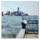 Créations de Susan Savad -- Un pêcheur se prépare à pêcher sur la jetée de Hoboken dans le New Jersey par un bel après-midi ensoleillé avec la skyline de Manhattan au loin. La tour de la Liberté, partiellement achevée, est visible à l'horizon.