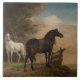Ce dessin présente une peinture de l'artiste hollandais Paulus Potter (1625-1654), spécialisé dans la représentation d'animaux. Cette oeuvre montre deux chevaux dans un pré près de quelques arbres et une porte en bois. L'un des chevaux a un manteau blanc, tandis que l'autre est de couleur brun foncé. Le cheval brun semble avoir peur, tandis que le cheval blanc est debout près des arbres qui observent l'autre cheval. Les deux chevaux ont de longues queues et des manes. Leurs oreilles sont piquées. Dans l'arrière - plan, il y a un ciel nuageux avec des oiseaux qui volent dans l'air, et il y a des vaches et d'autres animaux dans les champs éloignés. L'oeuvre originale a été peinte en 1649.