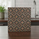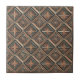 This striking ceramic tile design features an aged bronze and verdigris color palette with a bold industrial aesthetic. The pattern is built from repeating diamond shapes that frame alternating wheel-style medallions and cross-beam motifs, creating a rugged, architectural look. Subtle teal patina textures soften the metallic surfaces, giving the tile an authentically weathered appearance reminiscent of oxidized bronze panels. Perfect for adding a touch of vintage factory-style charm to home décor, kitchen accents, craft projects, or custom wall art. Search ID1227 to see other metallic geometric designs in this series. Note: design adapted from generative content.