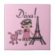 T-shirts de diva, combinaisons, tasses, sacs, cartes, autocollants, porte - clés, coussins, horloges murales, et beaucoup plus avec une conception mignonne de diva comportant une fille d'une chevelure noire dans un casquette et une robe rose avec son caniche rose près de Tour Eiffel !