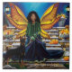Une fée aux ailes orange et jaune sur des marches en pierre qui mènent peut-être au royaume des Fées. La Fée afro-américaine n'est pas seule, elle est avec son chien doberman gardien ce jour d'automne.