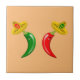 Ce magnifique carrelage comporte une paire de piments, un piment rouge et un piment vert. Ils ont tous deux les yeux noirs et la bouche rose. Chaque chili porte un casquette sombrero qui a un crâne de la couleur opposée au chili sur elle pour célébrer la fête mexicaine de la mort, Dia De Los Muertos. Le sombrero contient également trois fleurs avec alternance des pétales rouges et verts représentant le drapeau du Mexique.