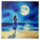 Carrelage en céramique illustrant une jeune femme solitaire en robe bleue debout au bord d'une plage, regardant la pleine lune réfléchissant sur l'océan. Le ciel nocturne serein est parsemé d'étoiles.
