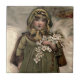 Quelle image douce de l'hiver. Cette copie vintage montre une jeune fille avec les joues attrayantes habillées dans une robe verte avec le châle ou le cap. Elle se tient dans la neige tenant les fleurs blanches avec les centres jaunes. Robert Ellice Mack a peint ceci pendant l'ère victorienne en 1886.