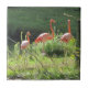 Un beau cadre dans un parc. Un étang avec trois flamants roses qui se baladent par une chaude journée d'été.