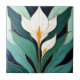 Ce carreau de céramique présente un lys calla stylisé dans un style Art déco classique, avec de gracieuses pétales blanches, des centres dorés chauds et des feuilles vertes et sarcelles en couches sur un fond bleu foncé. L'œuvre d'art est imprimée sur une surface de carreau lisse, gardant les couleurs nettes et les lignes propres. Cela fonctionne magnifiquement dans de nombreux contextes : affiché sur un dessus de table ou un chevalet, ajouté à un arrangement mural, incorporé dans des travaux de carrelage de cuisine ou de salle de bain, utilisé sur des contremarches d'escalier, ou inclus dans des espaces extérieurs couverts à l'abri de la lumière directe du soleil. Il peut également être utilisé dans des incrustations de meubles, encadré comme une œuvre d'art murale, ou regroupé avec d'autres carreaux pour créer un motif saisissant.