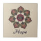 Collage de fleur en tissu imitation unique coupé de morceaux de matériaux richement décoratifs dans une palette de rouge foncé, bleu marine, et beige sur un arrière - plan texturé de tissu bronzé. Les pétales sont arrangés pour former une fleur à sept pointes dans le style appliqué, avec le mot inspirant "Hope" écrit ci-dessous.