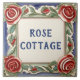 "plaque de nom de maison personnalisée", "plaque de nom de maison personnalisée", "signe texte customisé personnel", "tuile en céramique de casa de fleurs roses", "fleurs roses romantiques", "art bleu vert vintage", "nature fleurie d'été traditionnelle", "nom de famille dernier", "signalétique de maison de chalet fleurie", "villa de campagne décorative rustique"