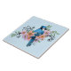 Un oiseau de geai bleu entouré de fleurs printanières rose, violet et pêche de couleur pastel sur fond bleu clair.