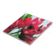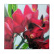 La photo originale de MaeFlowers, présentée sur ce petit carrelage en céramique aux couleurs vives, est un closep de fleurs rouges en fleur, avec leurs longs feuilles verts contre un arrière - plan bleu ciel clair. Près du centre de la photo, l'une des fleurs est en pleine floraison, avec ses pétales séchant et curling aux bords, exposant le centre à pointe jaune de la fleur.
