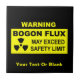 Un panneau d'avertissement noir et jaune avec le texte suivant : "AVERTISSEMENT, BOGON FLUX, PEUT DÉPASSER LA LIMITE DE SÉCURITÉ." Un symbole d'avertissement de matières radioactives apparaît également. Le bogon est une particule élémentaire qui porte la propriété de la bogosité, ou d'être bidon (c'est-à-dire fausse de mauvaise). Tous les humains sont des émetteurs naturels de bogons de basse altitude. Les niveaux d'émission fluctuent avec le temps. Les politiciens, d'autres individus tels que les vendeurs de voitures d'occasion, sont des sources élevées de faux-semblants. Lorsque de tels individus émettent des niveaux extrêmement élevés d'impostures, comme lorsqu'ils font des promesses de campagne, un flot d'impostures peut se produire. Un flux bogon peut être très dangereux pour ceux de la région. Bogon était à l'origine un jargon hacker ayant à voir avec de fausses adresses sur un réseau informatique.