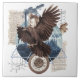 L'image d'un collage d'aigle est une représentation fascinante qui combine différents éléments et symboles dans une composition artistique. Au premier plan de ce collage se trouve un majestueux aigle volant qui capte l'attention du spectateur. L'aigle est un symbole de force, de liberté et de majesté et pourrait servir ici de motif central qui ancre le sens du collage. D'autres éléments et symboles sont disposés autour de l'aigle. Un ange prie, qui pourrait représenter un lien entre le ciel et la terre ou des éléments spirituels de croyance. Cela donne au collage une dimension spirituelle et peut-être des express l'espoir et la protection. Une horloge antique dans le collage pourrait indiquer la transition du temps. Cet élément fait référence à l'idée que tout disparaît et change avec le temps. Une coupure de journal jaunie pourrait servir de métaphore pour des événements historiques ou des histoires passées qui ont encore du sens dans le présent. Une usine dans le collage peut indiquer l'industrie et le progrès humain, mais aussi l'impact de l'environnement et l'altération de la nature par l'homme. La combinaison d'éléments de physique pourrait indiquer les lois et l'ordre naturels dans l'univers qui gouvernent notre monde. Il semble véhiculer un récit sur le lien entre la nature, le temps, la spiritualité, l'histoire et la science. Les différents éléments sont intelligemment combinés pour transmettre un message riche et complexe qui fait réfléchir le spectateur.