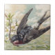 Romantic vintage picture of a flying swallow with a blossoming twig with the sea underneath.