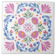 A square ceramic tile designs featuring folk-inspired botanical illustrations. Each tile displays a symmetrical garden motif—lilies, wild berries, and sprawling vines—rendered in soft watercolor washes. The artwork mimics a hand-painted glaze, with intentional "bleeding" edges and a subtle cracked ceramic texture (craquelure) for a rustic, heritage feel.