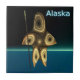 Image fractale brune suggérant un chasseur inuit très stylisé, portant des vêtements traditionnels en fourrure, tenant un harpon avec une tête d'ivoire. L'image est superposée à un arrière - plan représentant l'hiver polaire sombre. Le texte "Alaska" apparaît en bleu et blanc brillant.