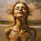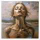 Fragments "Ophira" de la mer. Cette image capture un moment où la forme humaine se dissout dans les textures de l'eau et de la terre. Il parle de transformation, de la beauté de l'impermanence, et de la puissance brute de la nature. Une femme perdue dans l'étreinte de la mer, son visage leva vers le soleil doré, se dissolvant dans les éléments. Cette oeuvre illustre le délicat équilibre entre sérénité et érosion.