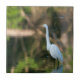 Un grand aigre blanc se tenant dans une rivière peu profonde qui suit un poisson. Le reflet de l'oiseau est visible dans les eaux encore calmes.