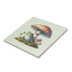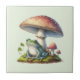 Carreau de céramique avec une illustration cool. Avec une grenouille verte assise sur un monticule d'herbe. Un gros champignon rouge le protège des intempéries. Quelques petits champignons à proximité.