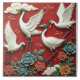 Quatre grues blanches aux têtes vertes et noires, dressées sur des branches florales colorées au milieu de nuages blancs et d'un ciel rouge profond.