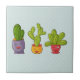 Un carrelage en céramique avec une illustration fantaisiste représentant 3 heureux petits cactus assis dans leurs pots de fleurs. Ils ont chacun leurs propres expressions uniques, souriantes et jolies.