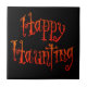 Texte "Happy Haunting" en lettres spectrales orange, avec quelques yeux fantomatiques, un dessin humoristique pour une Halloween obsédante