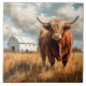 A highland cow in front of a white barn, blending pastoral charm with country elegance.