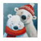 Cette image montre deux ours polaires dans une étreinte chaleureuse, dressée contre un arrière - plan enneigé et de tonalité turquoise. L'ours plus gros porte un casquette tricot rouge, décoré de motifs subtils, tandis que l'ours plus petit est enveloppé d'une écharpe rouge vif. Les deux ours ont des joues douces et roses et des expressions sereines, créant une atmosphère d'hiver douillette et affectueuse. Le style texturé et peint renforce la chaleur et le charme de la scène.
